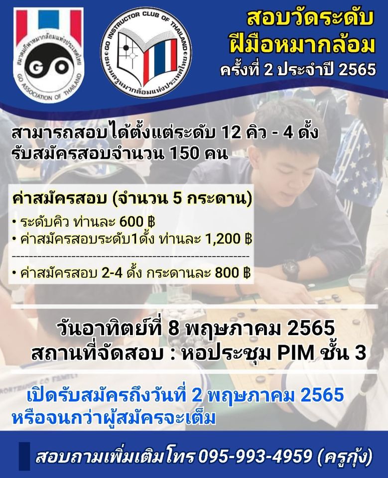 กำหนดการสอบ “วัดระดับฝีมือหมากล้อม” ในวันอาทิตย์ที่ 08 พฤษภาคม พ.ศ. 2565